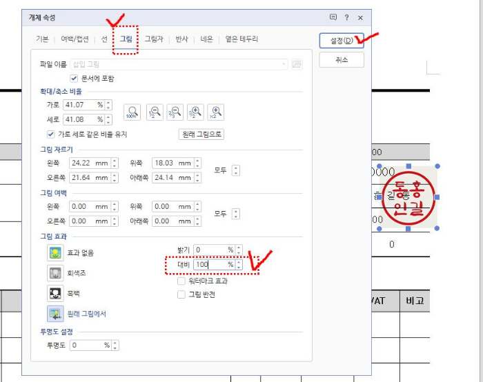 그림 효과에서 대비를 100% 로 지정해 주고 설정을 클릭합니다.