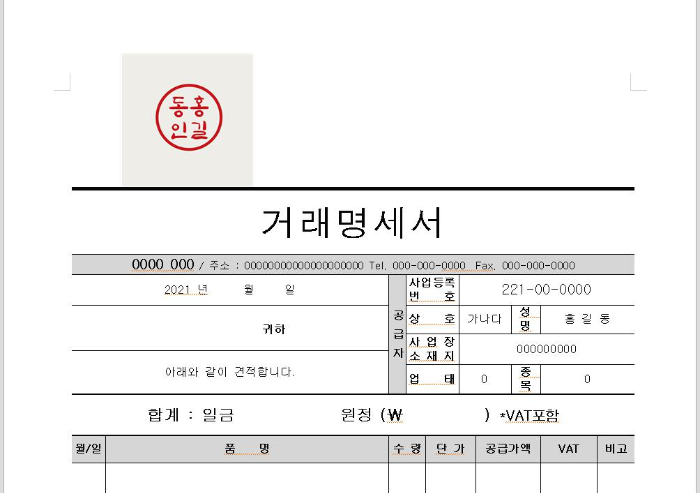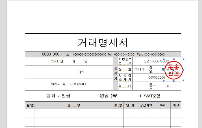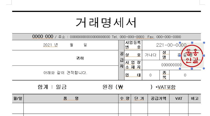 아래와 같이 거래명세서 서명란에 도장을 넣어서 사용하고 싶은데