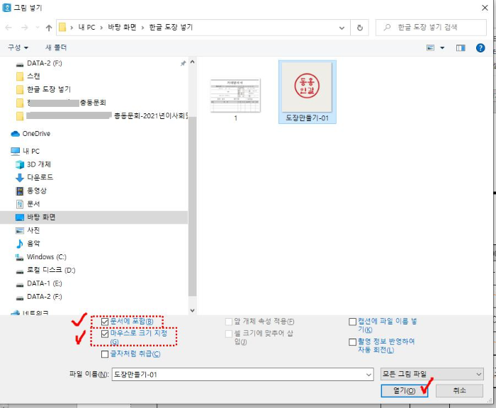 이렇게 하면 한글 파일에서 도장이 깔끔하게 들어갑니다.