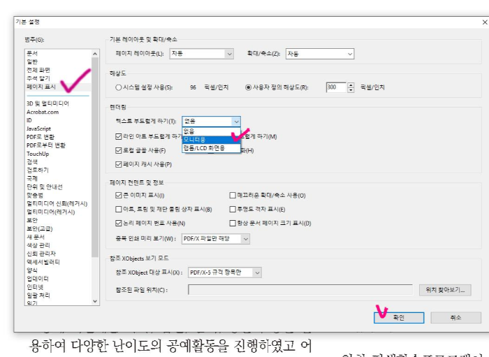페이지 표시 >> 텍스트 부드럽게 하기 >> 모니터용 체크 >> 확인